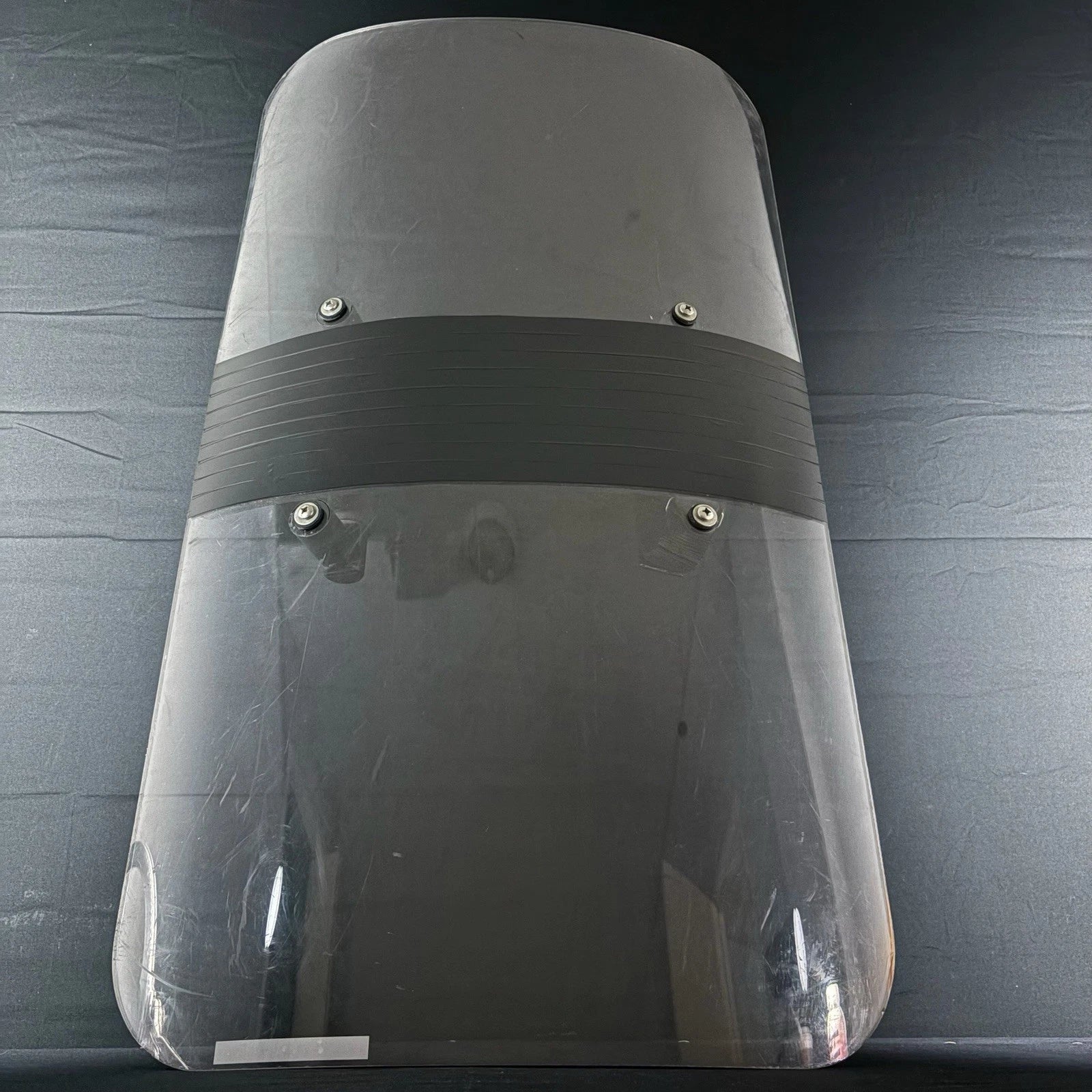 This shield is in good working condition. There are surface scuffs from prolonged storage but no cracks or structural damage. All mounting hardware is intact and secure, with clear visibility through the shield.