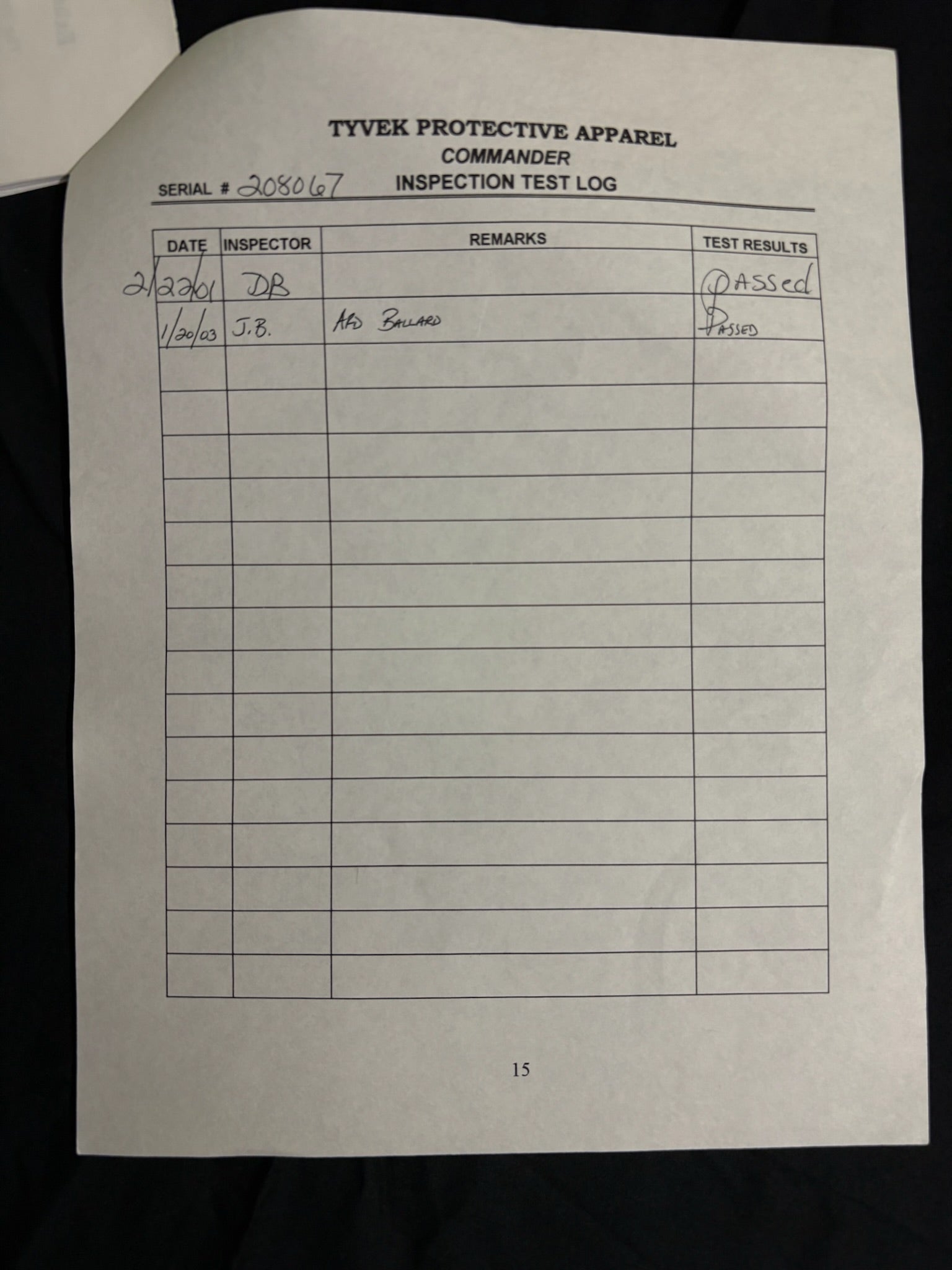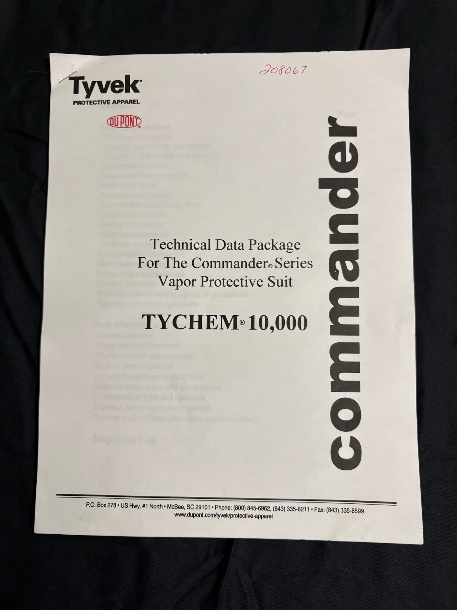 This suit is “New Old Stock”. It was manufactured in 2001. It is brand new, never used. The last pressure test was done in 2003. A pressured seal test must be performed before the suit is used for Hazmat. There are some very light discoloration spots on the face shield, as shown in the pictures.